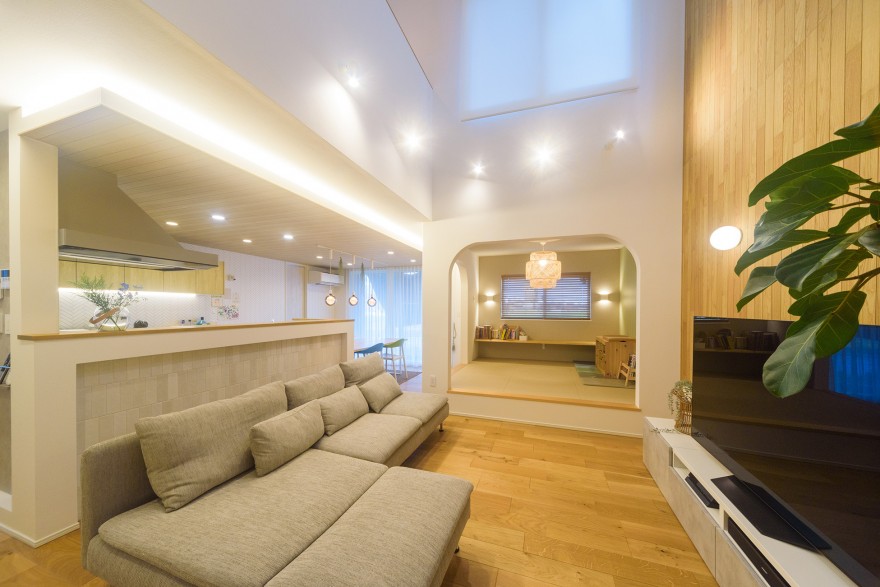 リビングには高い天井を設け、開放感、吹き抜けを介した光の取り入れ方が工夫されています。他にも、吹き抜けと一体となるように設けた畳スペース、中二階の書斎など、工夫が詰まった唯一無二の空間もポイントです。